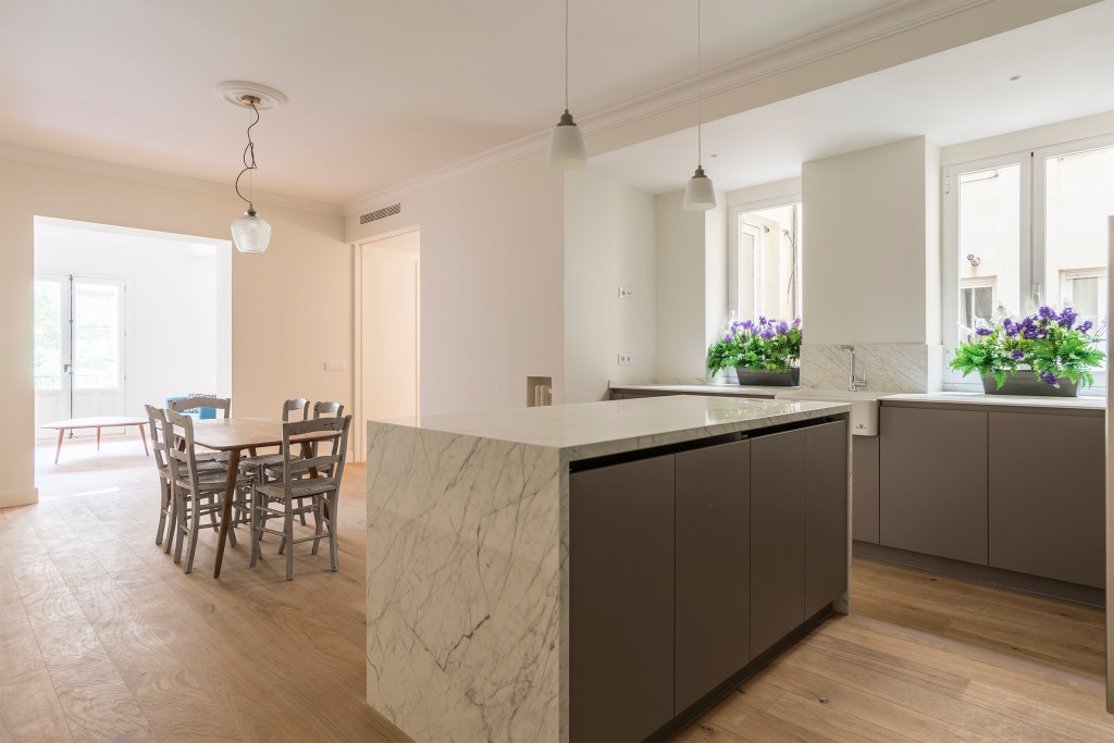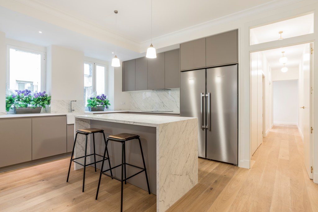 - Cocina grande equipada con isla central y nevera americana.
