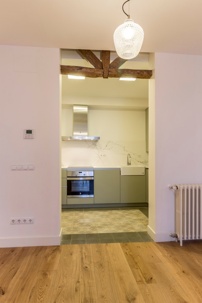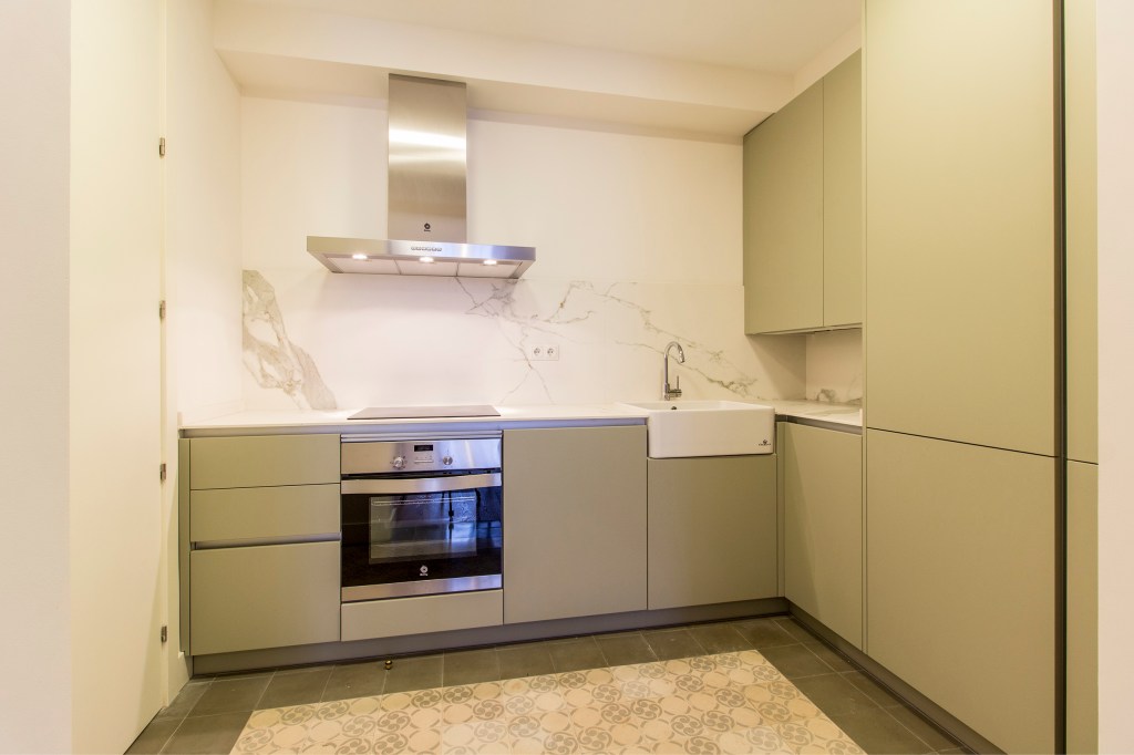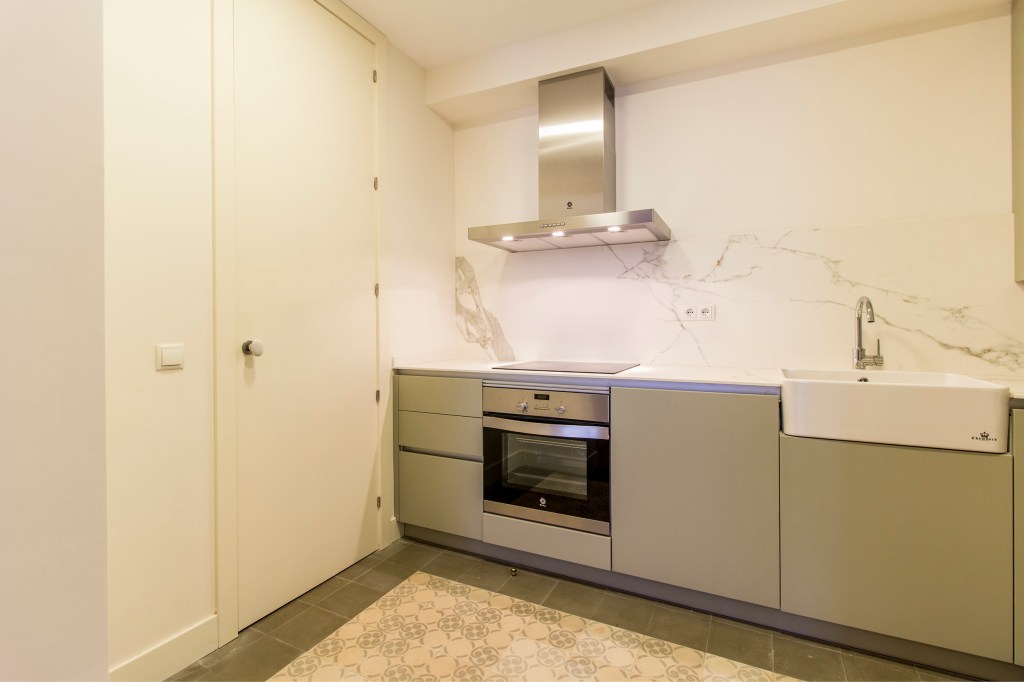 Cocina totalmente equipada con electrodomésticos de primera calidad. Piso exterior muy tranquilo (ventanas a la calle Relatores) en una zona estratégica, a escasos metros del mercado de Antón Martín, de los Cines Ideal, del Madrid de los Austrias, etc.